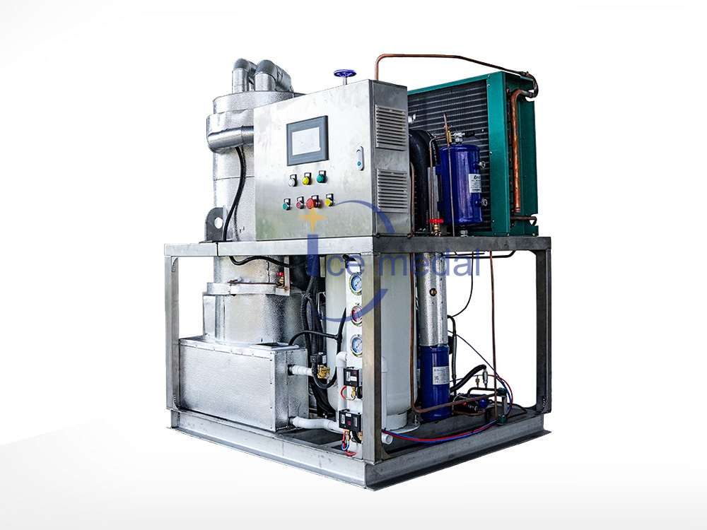 2、管冰机所有与制冰水接触部分材质均是食用级材料。 由多根不锈钢管组成蒸发器制冷剂在管与管之间流动,水在管内从上往下在分水器的作用下呈螺旋状流动, 水在流动过程中形成冰。