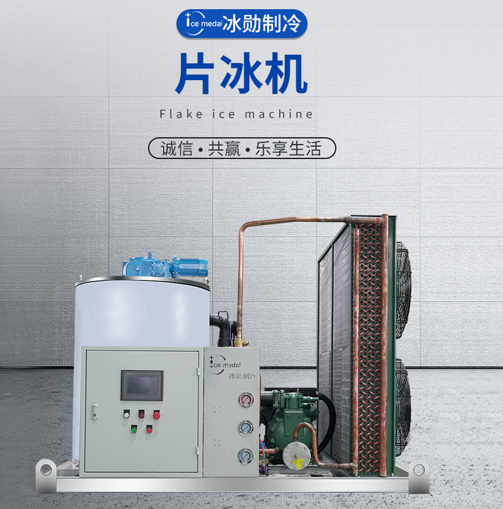 片冰机,制冰机的一种,片薄、干爽疏松状的白色冰。平面形状不规则,厚度15毫米 —22毫米,直径约为12 - 45毫米。 片冰质地干燥、柔软无尖锐棱角,不会刺伤冷冻物体。冷藏包装过程中其扁平的外型将尽可能避免伤害到被冷藏物,对被包装食品起到保护作用。 片冰具有大接触面积、快速制冷、储藏运输便捷、减少热交换,保持冰的温度等特点。自动片冰机采用先进的立式螺旋刀切冰式蒸发器,制冰时由冰桶内部的分水装置将水均匀的分洒至 冰桶内壁快速结冰,冰成型后由螺旋冰刀切冰落下。